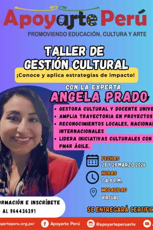 Taller de Gestión Cultural 🔥¡Aprende de la mejor! Taller de Gestión Cultural con Angela Prado ✨ ¿Quieres que tus ideas culturales se conviertan en proyectos exitosos y reconocidos? Participa en nuestro Taller Virtual de Gestión Cultural, impartido por la destacada Angela Prado Reyes, profesional con: 🌟 Más de 10 años de experiencia en gestión de proyectos sociales y culturales. 🌟 Reconocida Docente Universitaria (Docente Excelencia) 🌟 Amplia trayectoria y reconocimientos por su impacto cultural a nivel local, regional y nacional. 🧐Descubre las herramientas y estrategias esenciales para: ✅Planificar y ejecutar proyectos con propósito. ✅Conectar con tu público y generar valor.